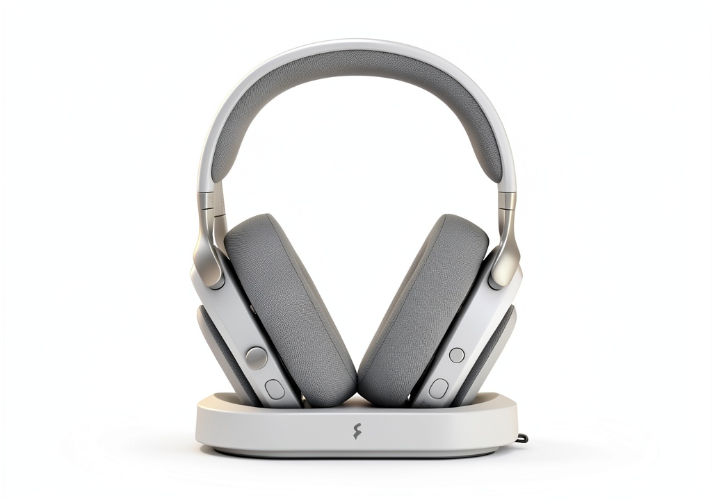 The inductive charging stand uses magnetic docking to automatically charge the headset when placed on it, eliminating the need for cables.